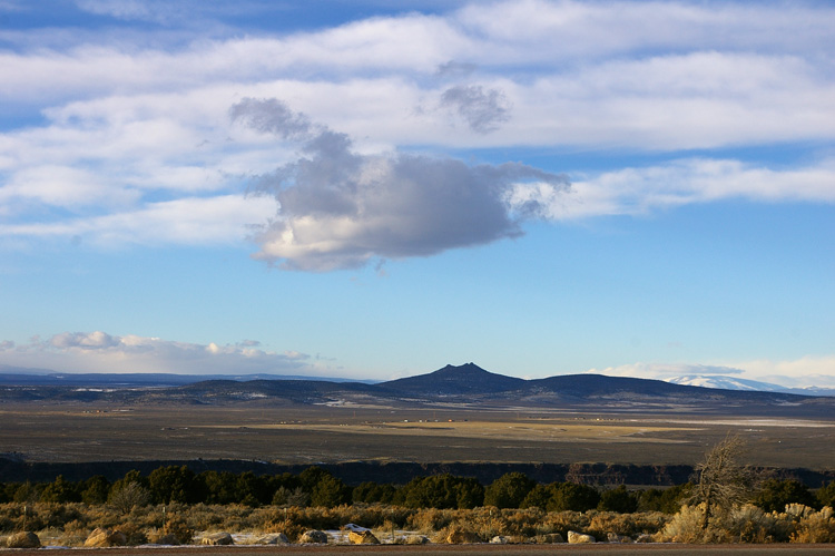 Tres Orejas (Carson), San Antonio Peak ( background right, w/ snow) Rio Grande Gorge in foreground, note buildings on the plain