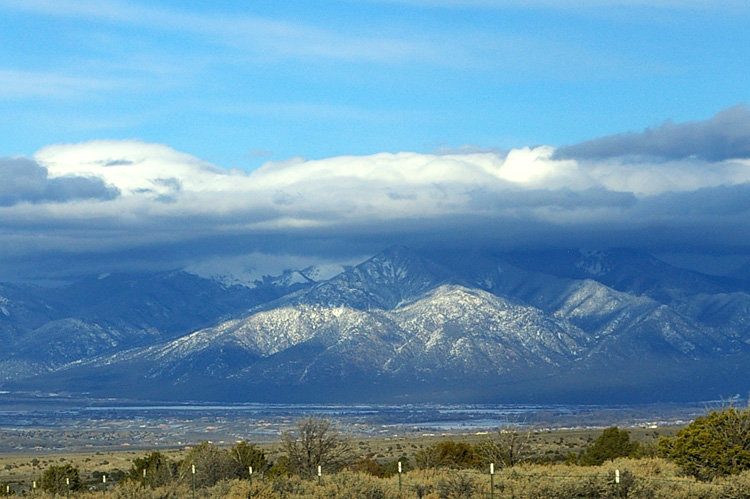 Sunlit snow on cloud-topped Taos Mountain Kachina Peak in left background, summit also in clouds
