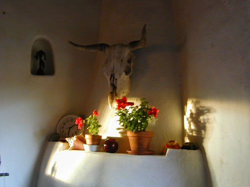 Low light, fuzzy, w/ petunias and skull