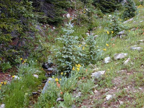 Wildflowers and young spruces along the creek